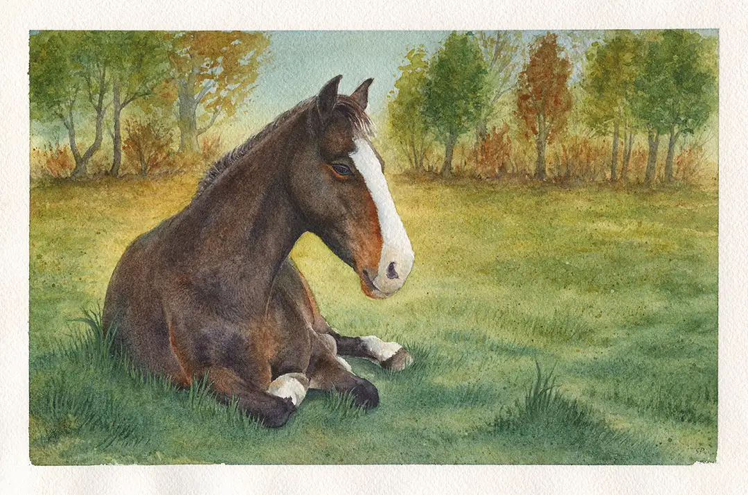 Seeing Lilly resting in the open field — completely at ease — felt like witnessing a quiet triumph. A small but powerful expression of healing. This painting is my way of honouring that moment, her journey, and the gentle wisdom horses bring into our lives when we choose to slow down and listen.
